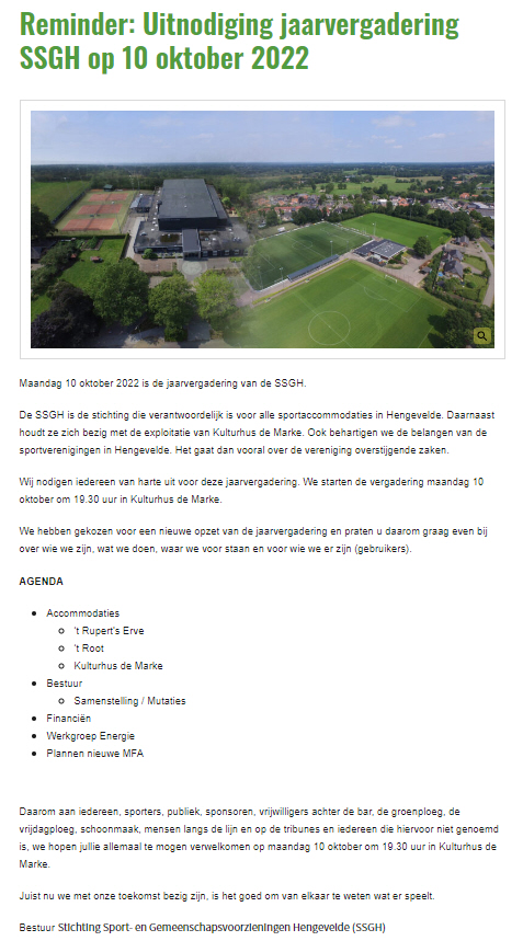 De SSGH vindt het belangrijk om meer zichtbaar te zijn. In Hengevelde weet men niet altijd wat de rol is van de SSGH. Als er zaken zijn, dan vinden wij dat de mensen ons wel moeten weten te vinden, dus ook vanuit die hoedanigheid vinden wij een jaarvergadering heel belangrijk. De SSGH wil zeker niet op de voorgrond staan, wij zijn faciliterend voor de verenigingen en de gemeenschap. De SSGH heeft een maatschappelijke rol binnen de gemeenschap en wij willen dan ook laten zien waar wij mee bezig zijn. Ook willen wij in deze vergadering financiële verantwoordelijkheid afleggen. Dit moeten wij al richting de Gemeente, maar ook richting de gemeenschap vinden we dit wenselijk. Wij verwachten dat we de komende tijd voor hele grote veranderingen staan (nieuwe MFA in Hengevelde). Met de hele gemeenschap staan wij voor het maken van belangrijke keuzes. De SSGH wil dan ook dat iedereen de mogelijkheid heeft om mee te praten en mee te beslissen.